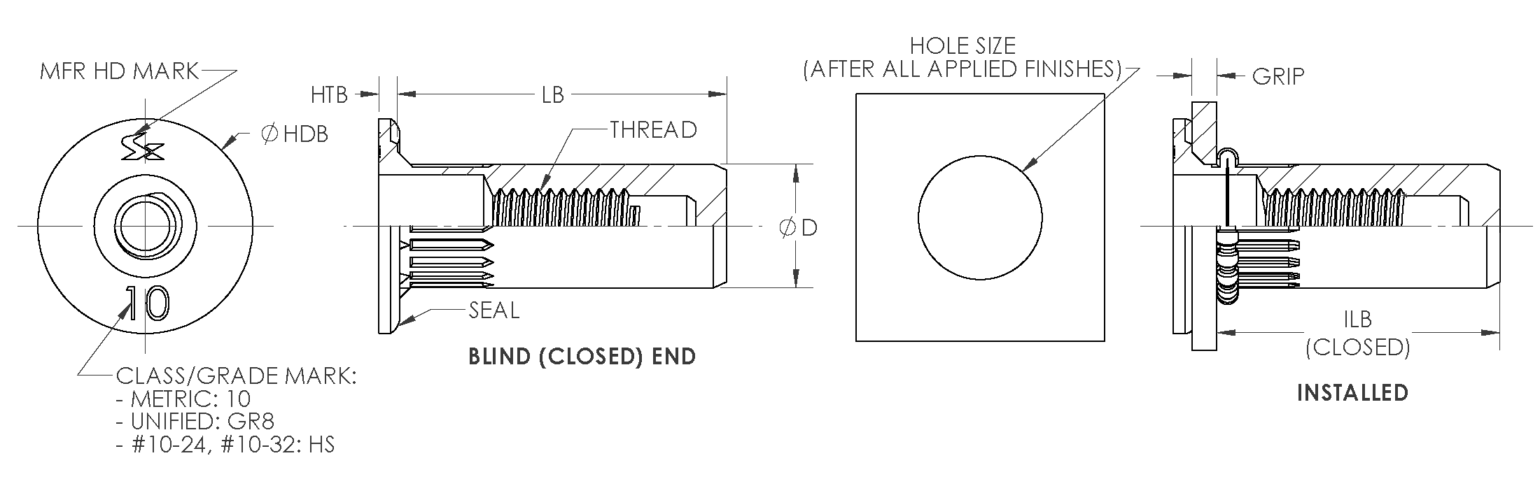 Sherex's High Strength Round Body Rivet Closed End Sealed unified threaded rivet nuts are made for appliations that use Grade 8 hardware or for high clamp load environments. Closed end sealed rivet nuts help keep dust and liquid from entering the threads and base material. The round body design is based on the Optisert design with underhead wedges that help spin out performance.