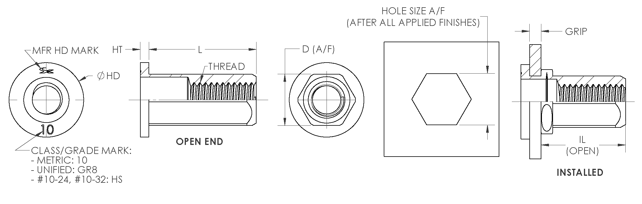 Sherex's High Strength Hex Body Rivet Open End metric rivet nuts are made for applications that are used with Class 10.9 hardware or in high proof load environments. Applications in automotive, heavy truck, construction and agricultural equipment and renewables are ideal industries for these rivet nuts.